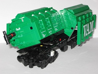 Typical green freight wagon of the Dutch Waste Disposal Company (Vuil Afvoer Maatschappij or VAM in short). The wagon consists of two containers that can be tilted. The doors can be opened to dump the “waste” when the containers are in the tilted position. When one containers is tilted, the second one is tilted to the other side at the same time to prevent the wagon from falling over just like the real VAM-wagon! The roofs of the containers can be taken off for filling them with “waste”. The set comes with very detailed stickers. All parts are brand new.